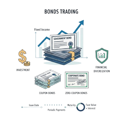 Bond trading involves the buying and selling of corporate and government bonds in the bond market. On the maturity date, the issuer repays the bond’s face value, interest rate, and any fixed or variable interest payments to bondholders. Bond investing is known for being an effective financial diversification strategy.